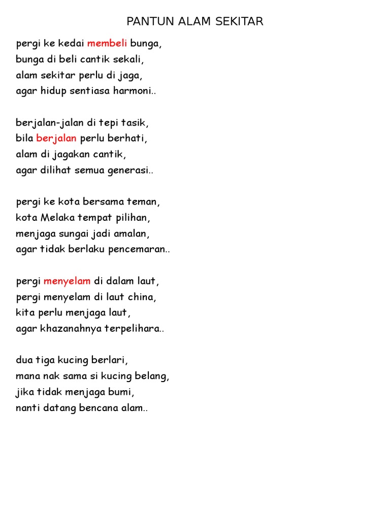 Selain itu pengeksplotasian alam sekitar turut membawa kesan terhadap fenomena pemanasan global. Banyak daripada puisi Melayu tergolong dalam genre tradisional yang muncul dalam zaman sebelum berkembangnya tradisi tulisan pencetakan. Isi pantun kaya dengan khazanah ilmu dan Berperanan sebagai alat untuk menyampaikan nasihat pesanan teguran kiasan sindiran dan melahirkan perasaan hiba.